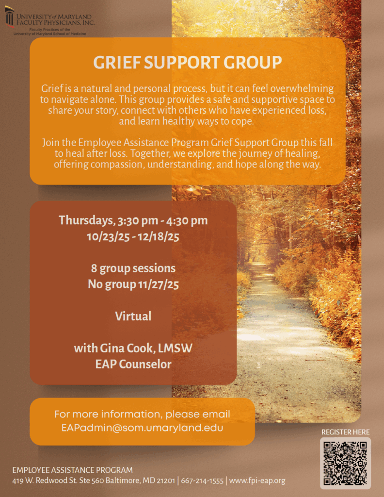 If you’ve experienced loss, join the virtual Employee Assistance Program Grief Support Group on Thursdays, 3:30–4:30pm, starting October 23. Led by Gina Cook (LMSW EAP Counselor), the group meets online weekly until December 18 (no meeting on November 27). You’ll find a safe, supportive space to process your grief and heal after a loss. For more info, email EAPadmin@som.umaryland.edu.
